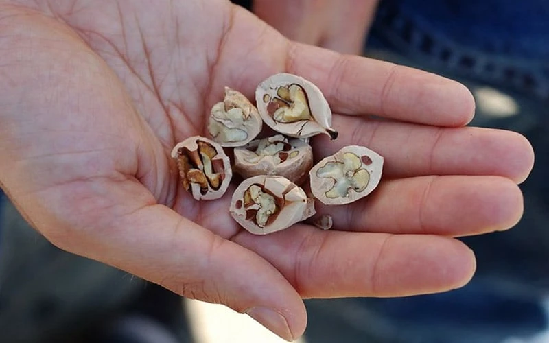 Due to its extremely attractive “shaggy” bark that peels away from the tree in thin strips up to 4 feet long, the Shagbark Hickory is a tree that is impossible to go unnoticed. Passersby just have to stop and reach out and touch it. But the fine attributes don’t stop there. This Hickory produces what many chefs and nut connoisseurs consider to be the best tasting edible nuts of any North American native nut-bearing tree, surpassing in flavor even pecans and walnuts. Growing an average of 70 feet tall and 50 feet wide, and clothed with shaggy bark and attractive, pinnately compound green leaves that turn a brilliant golden-yellow in fall, the Shagbark Hickory is a fine addition to the edible landscape that also shade tree and a source of food and shelter for wildlife.Â
